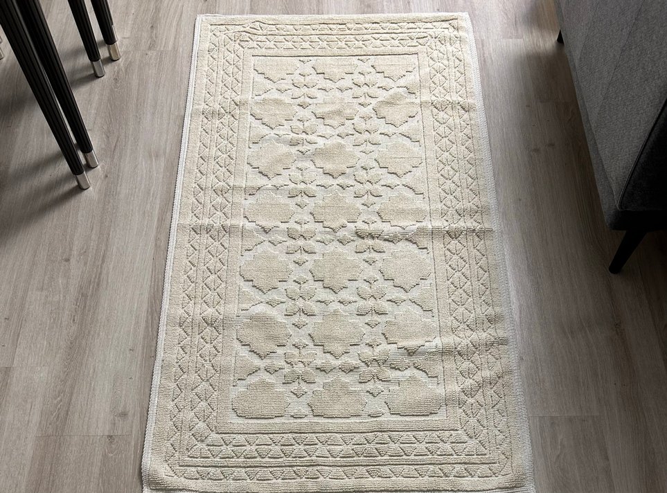 Açık bej renkte, 60x100 cm nakışlı desenli banyo paspası, banyonuza zarif bir dokunuş katar.