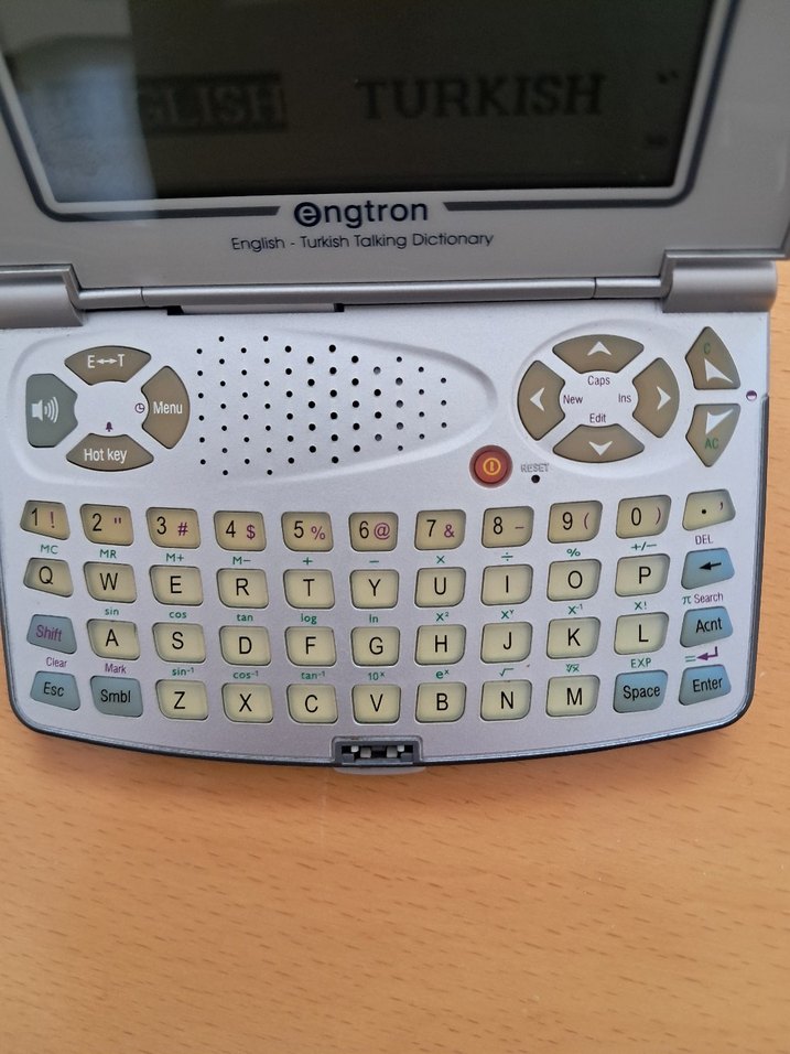 Engtron İngilizce-Türkçe konuşan sözlük için gri ve beyaz renklerde, Türkçe ve İngilizce tuşlar ile fonksiyon tuşları içeren kompakt klavye.