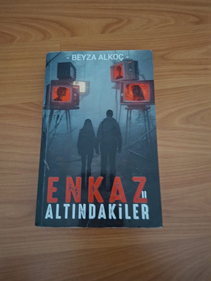 Beyza Alkoç'un "Enkaz Altındakiler" adlı romanı, farklı silüetlerin göründüğü ekranların önünde duran iki figürün yer aldığı gizemli bir kapak tasarımına sahip.
