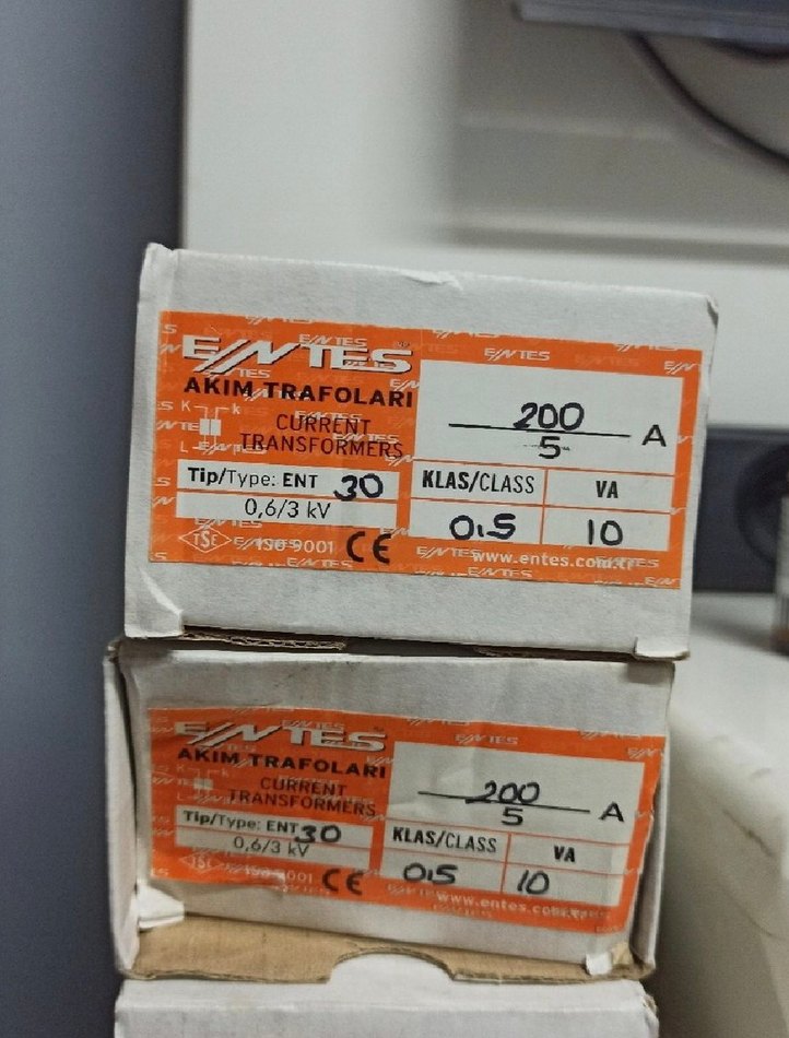Entes marka, 200A kapasiteli ve 0,6/3 kV gerilim değerine sahip akım trafosu. Teknik özellikler kutu üzerinde belirtilmiştir.