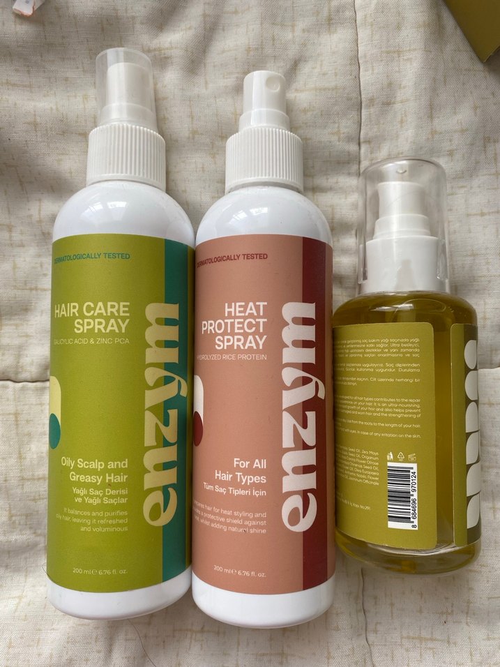 Enzym markasının yağlı saçlar için saç bakım spreyi ve tüm saç tipleri için ısı koruyucu spreyi. Dermatolojik olarak test edilmiştir. Hiç kullanılmadı . Paket halinde 450