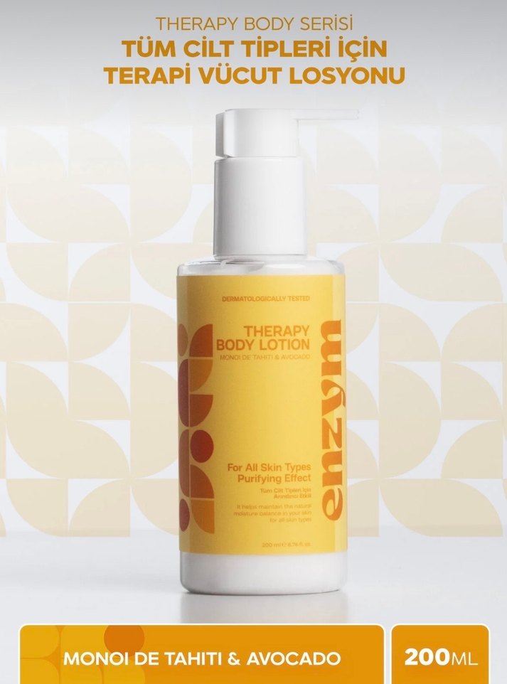 Enzym Therapy Vücut Losyonu, Monoi de Tahiti ve Avokado içerir, tüm cilt tipleri için uygundur. Arındırıcı etkisi vardır ve 200ML şişededir.
