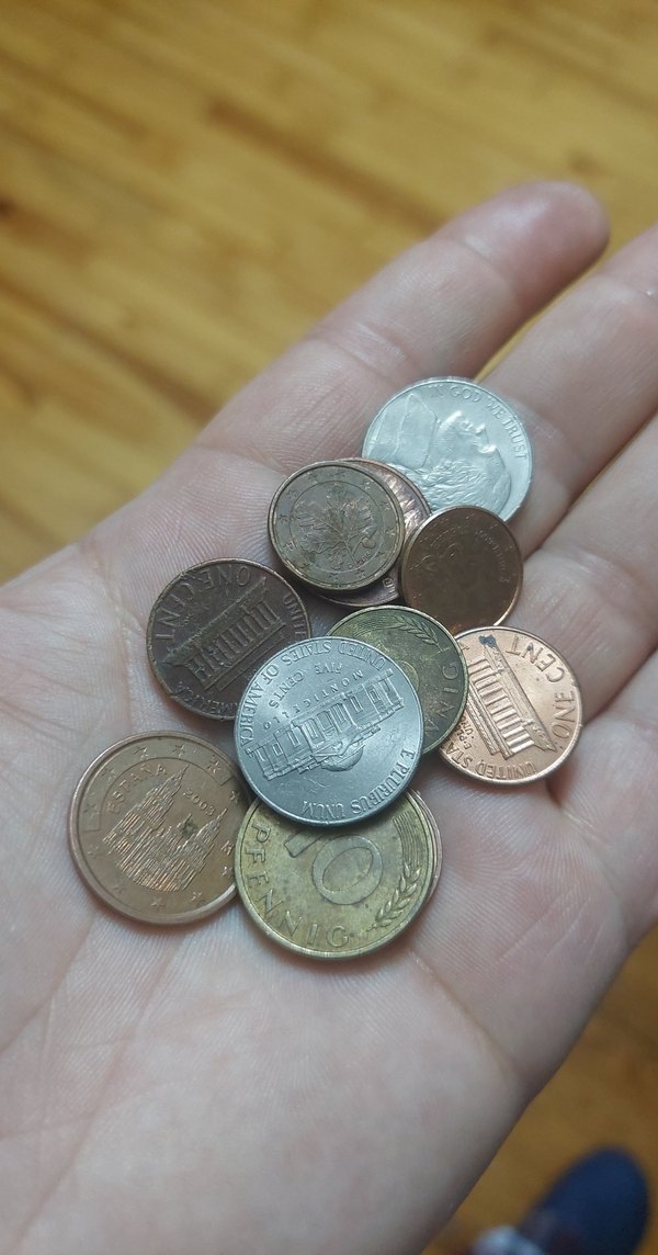 11 adet.Farklı ülkelerden çeşitli boyut ve tasarımlarda madeni paralar el üzerinde gösteriliyor.