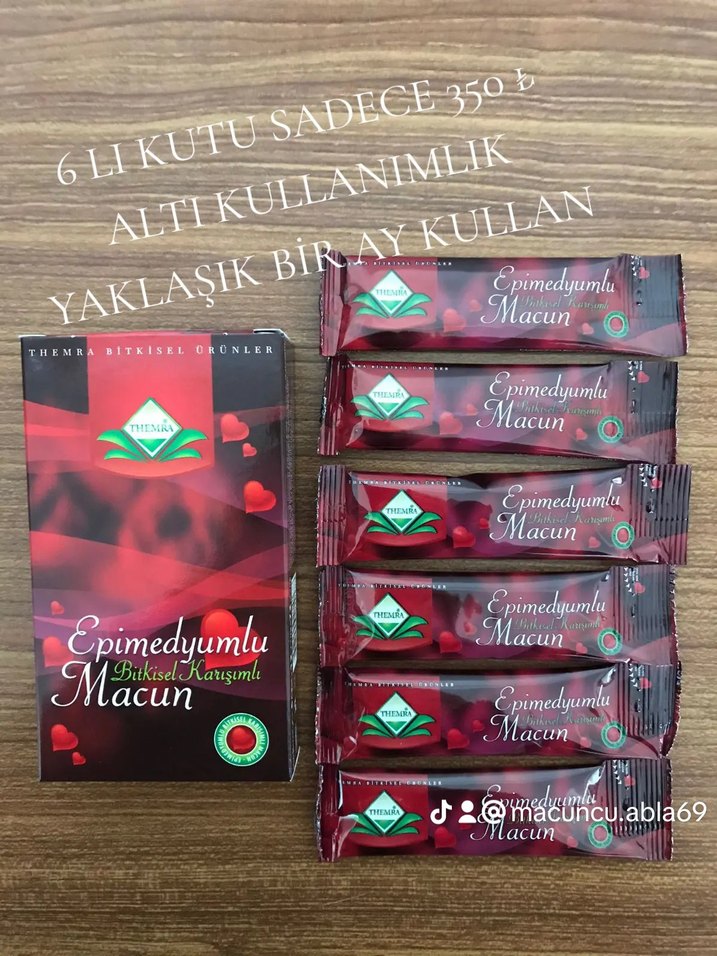 kutuda altı adet epimedyumlu bitkisel macun bulunur. Yaklaşık bir aylık kullanım için uygun, koyu bordo renkte ve kullanımı kolay paketlerde sunulmuştur.