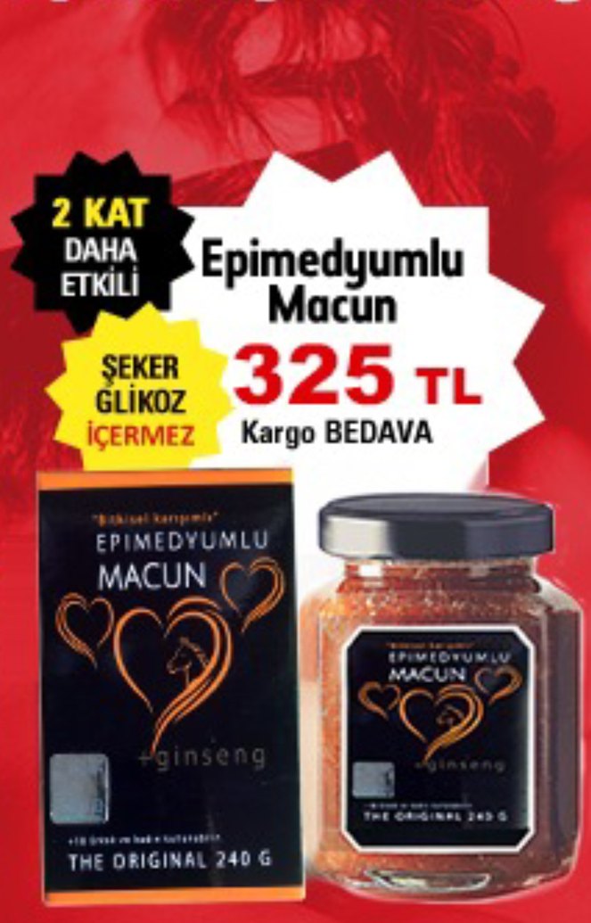 *Gıda değildir* TAKVİYEDİR FİYAT KISA SURE İÇİN GEÇERLİ Yakında güncellenerek 450 tl ye çıkacaktır bu fırsatı kaçırmayın Kadın ♀️ve erkekler ♂️ kullanabilir Epimedyumlu macun mükemmel ürün erken gelme sorununu çözer sertleşmede maxsimum seviyeyeye çıkarır karşıdaki partneri çok memnun eder 1 kutuda 12 adet stick macun bulunur İsteyene kavanoz şeklinde de gönderim yapılır çoklu alımda indirim vardır bu ilanı alim yaparsınız kavanoz şeklinde de gönderim yapılacaktır. Ürünlerimizin yan etkisi olmayıp kutulu ve ambalajı açılmadan gizli paketlenerek gönderilecektir.