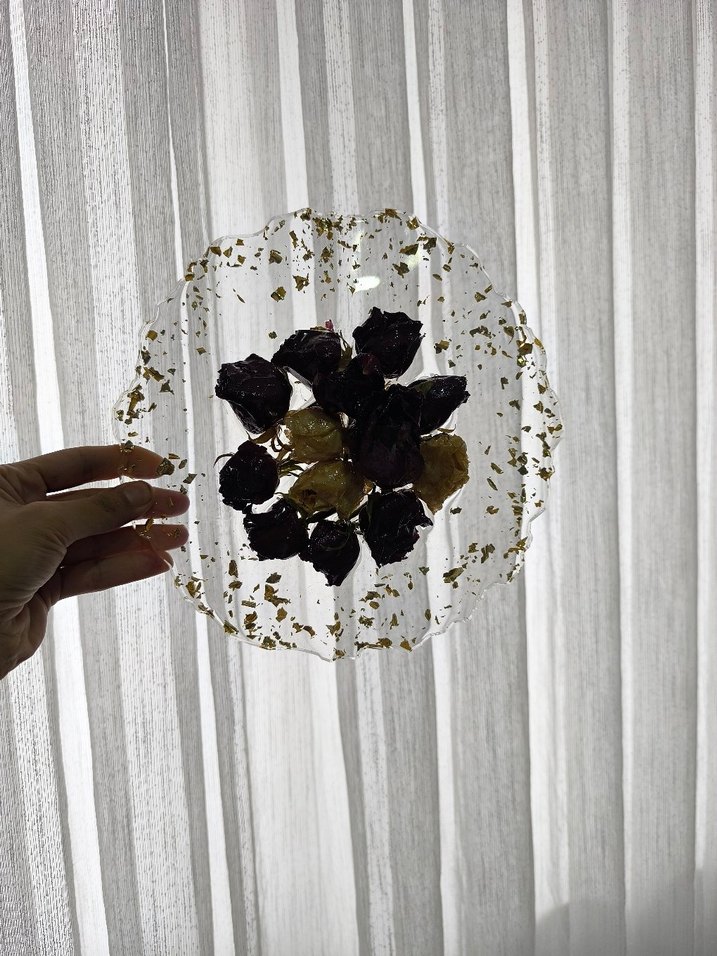 Altın parçacıklı şeffaf taban üzerinde çalışılmış çiçekleriniz en güzel saklama yöntemi. Özel siparişleriniz için lütfen mesaj atınız.