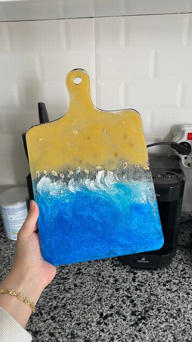El yapımı, kum ve deniz efektli epoksi doğrama tahtası. İster dekor, ister kullanıma uygun.