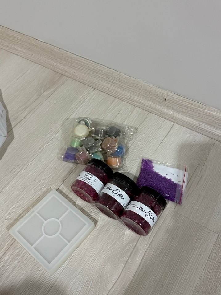 Epoksi Kare Bardak altlığı kalıbı 10cm Epoksi reçine için renkli cam kırıkları 3 kırmızı renk tonu Adolin sertleştirici (kutunun icindeki miktar görselde gösterilmiştir) Adolin Resin (kutunun icindeki miktar