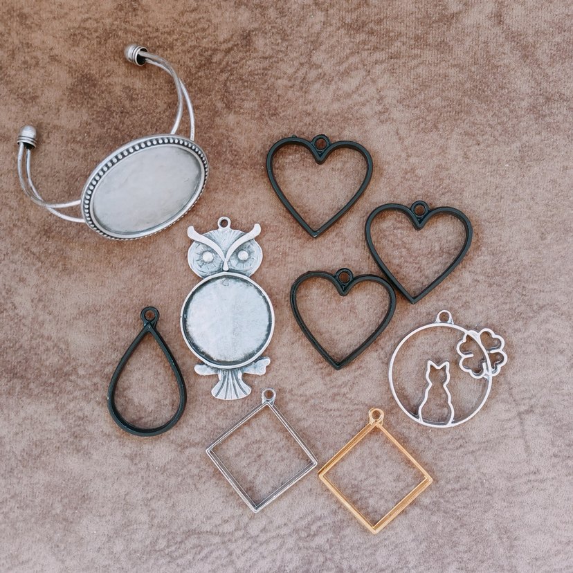 Epoksiyi bıraktığım için elimde kalan malzemeleri satıyorum. Fotoğraftakilerin tamamının fiyatıdır. 8 kolye ucu, bir bileklik aparatı. Damla şeklinde olanda hafif boya soyulması dışında hepsi sağlam. Boyutunu anlamak için son resme bakınız. #epoksikolyeaparati #epoksikolyeucu #kolyeucu #metalkolyeucu #metalaparat #takiaparati #kolyeaparati #bileklikaparati #epoksiicinkolyeucu #boskolyecercevesi #kolye #kolyecercevesi #uvepoksi