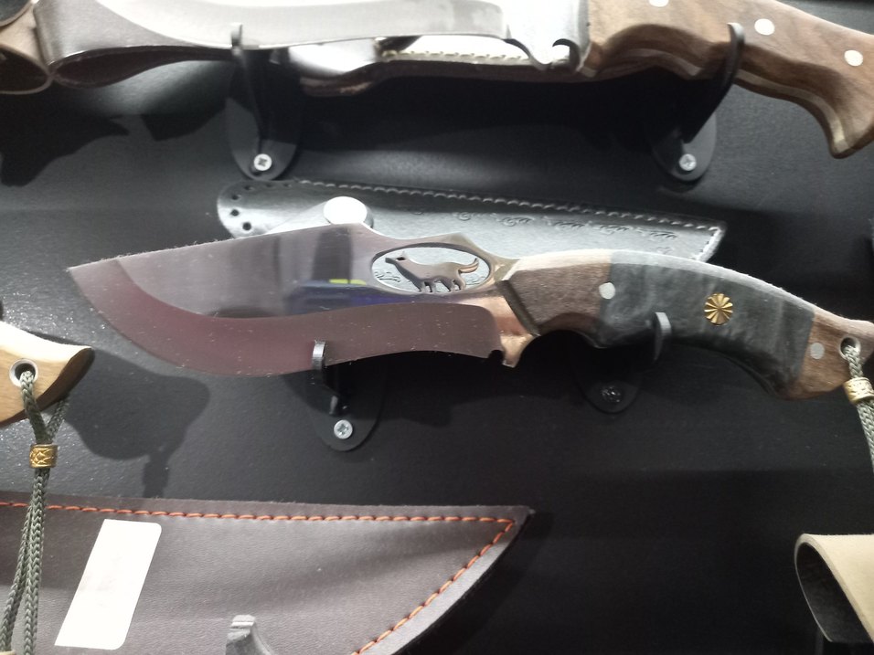 Kahverengi ahşap saplı, üzerinde kurt figürlü paslanmaz çelik bıçağa sahip. Güvenli saklama için deri kılıf dahil.
