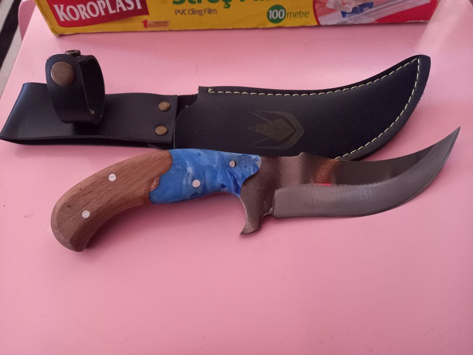 Koyu renkli, mavi saplı ve ahşap detaylı bıçak, siyah deri kılıf ile birlikte sunulmaktadır. Bıçak keskin ve sağlamdır.