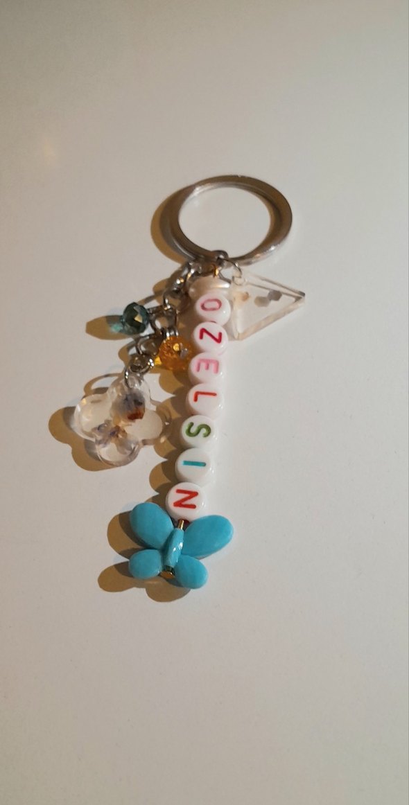 Bohem tarzda, "OZELSIN" yazılı renkli boncuklar ve turkuaz kelebek figürlü anahtarlık. Küçük dekoratif boncuklarla hareketlendirilmiştir.