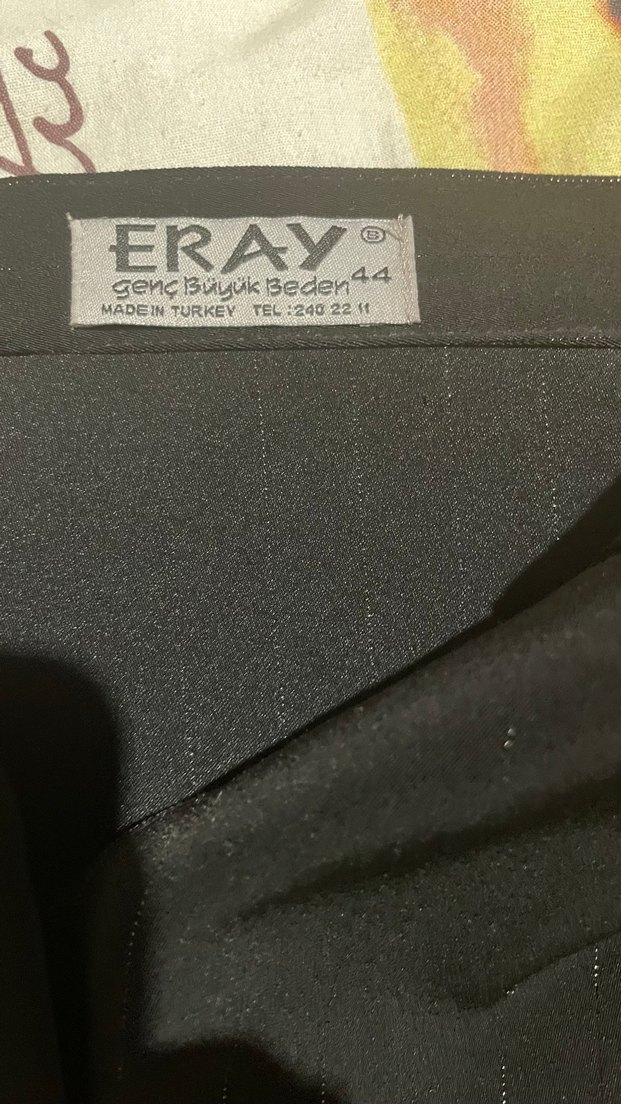 Eray marka siyah, parlak baskılı pantolon. Palazzo paça ve ofis ve iş ortamına uygun şık sokak stili. Türkiye'de üretilmiştir.