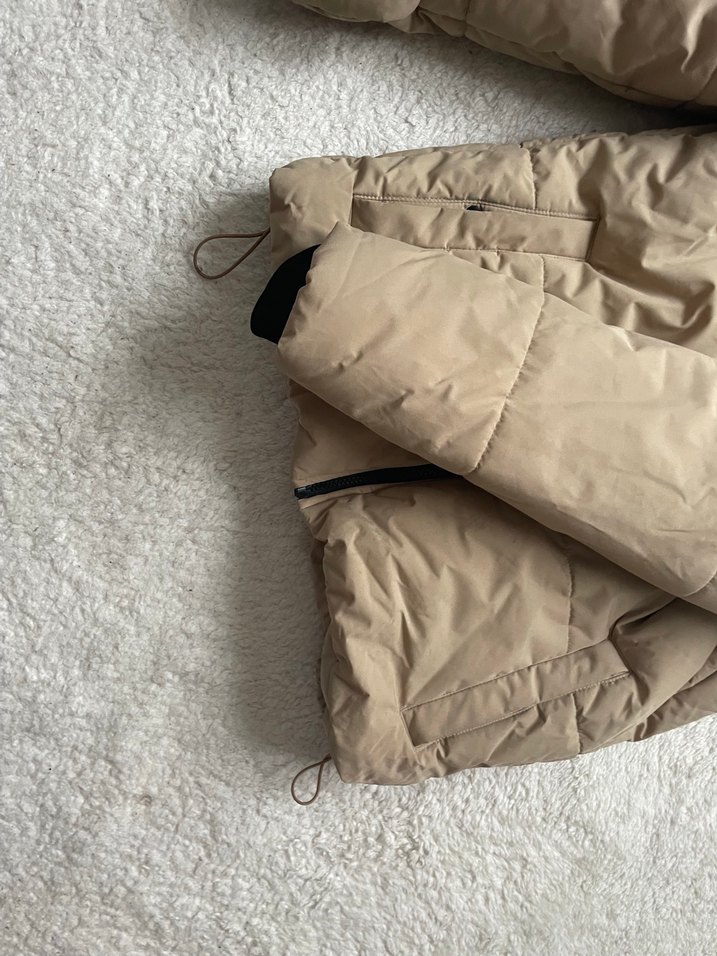 Fermuarlı bej kadın kışlık mont, midi boy ve fitted kesimlidir. Sentetik kumaştan üretilmiş, boğazlı ve günlük kullanıma uygun sade tasarımlıdır. Askılı kolludur ve normcore tarzındadır.