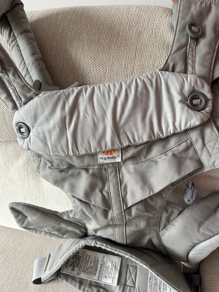 Ergobaby gri bebek taşıyıcı, rahat taşıma için sağlam askılar ve yastıklı destek sunar. Güvenli ve ergonomik bebek taşıma için tasarlanmıştır.