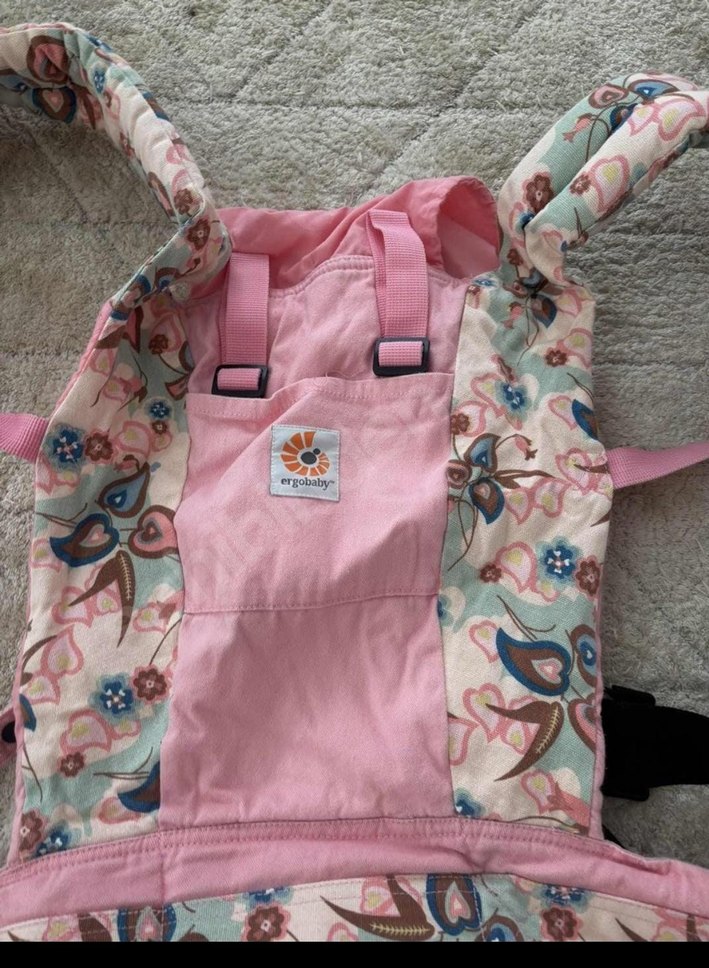 Ergobaby marka pembe ve çiçek desenli bebek taşıyıcı, ayarlanabilir askılarla konfor sağlar.