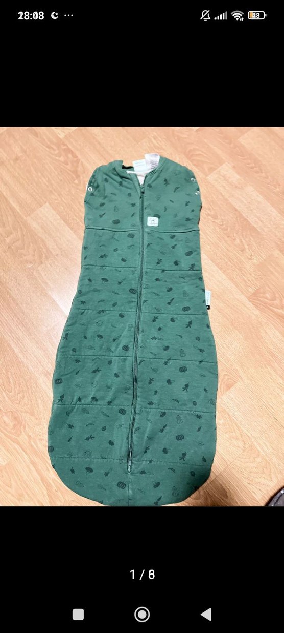 Koyu yeşil renkte, yumuşak ve sıcak kumaştan yapılmış, fermuarlı çocuk uyku tulumu. Rahat kullanım için tasarlanmıştır.