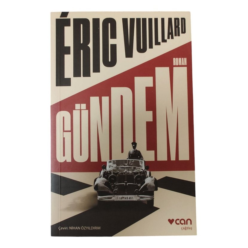 Eric Vuillard'ın 'Gündem' adlı romanı, koyu tonlarda kapak, eski model araba ve büyük tipografi içerir. Çeviri: Nihan Özyıldırım.