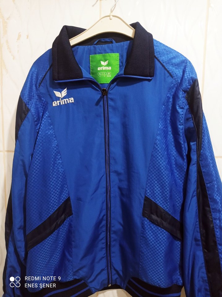 Erima markalı, fermuarlı, uzun kollu, mavi spor rüzgarlık. Sentetik kumaştan, salaş kesim ve bisiklet yaka özellikli, sportif kullanıma uygun.