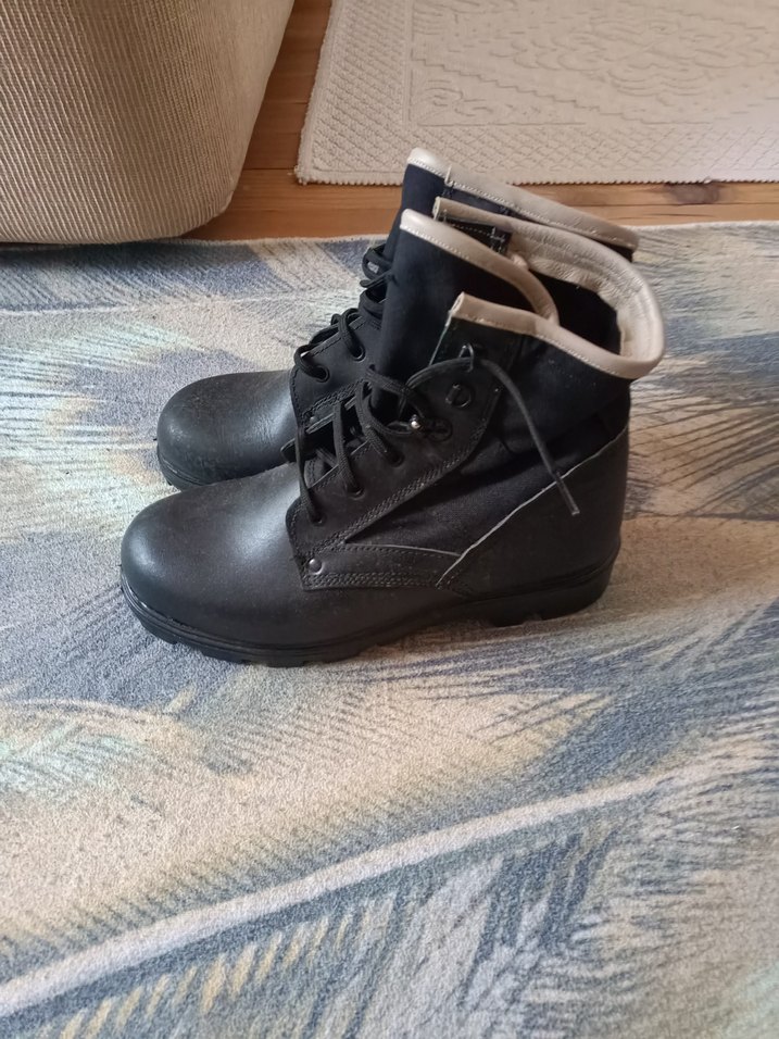 Siyah lastik erkek botlar, bağcıklı ve kemerli detaylara sahip. Sokak tarzı ve günlük kullanım için uygun, desensiz ve gri vurgu renkli.