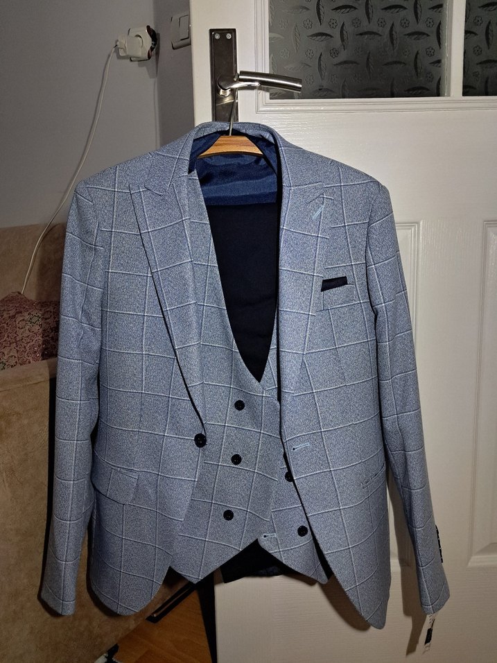 Düğünlerde bir kaç kere giyilmiştir. Damatlık Dünyasından alınmıştır. Yırtık leke vs. yoktur. Ceketi, yeleği, mendili ve pantalon verilicektir. Sonuncu fotoğraftaki pantalonun bedenidir. Pantalon koyu mavi ceket ve yelek açık mavi renktir.
