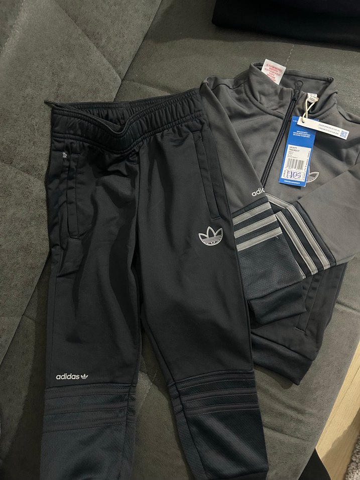 Erkekler için adidas gri fermuarlı, yüksek yakalı, baskılı detaylı ve sentetik kumaştan üretilmiş, dar kesim eşofman takımı. ️