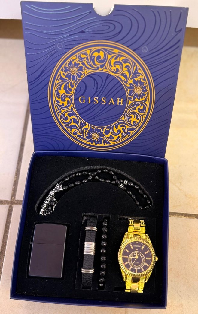 Erkekler için koyu altın renkli, bohem ve klasik tarzda saat seti. GISSAH markalı saat, çakmak ve aksesuarlar içerir. ⌚