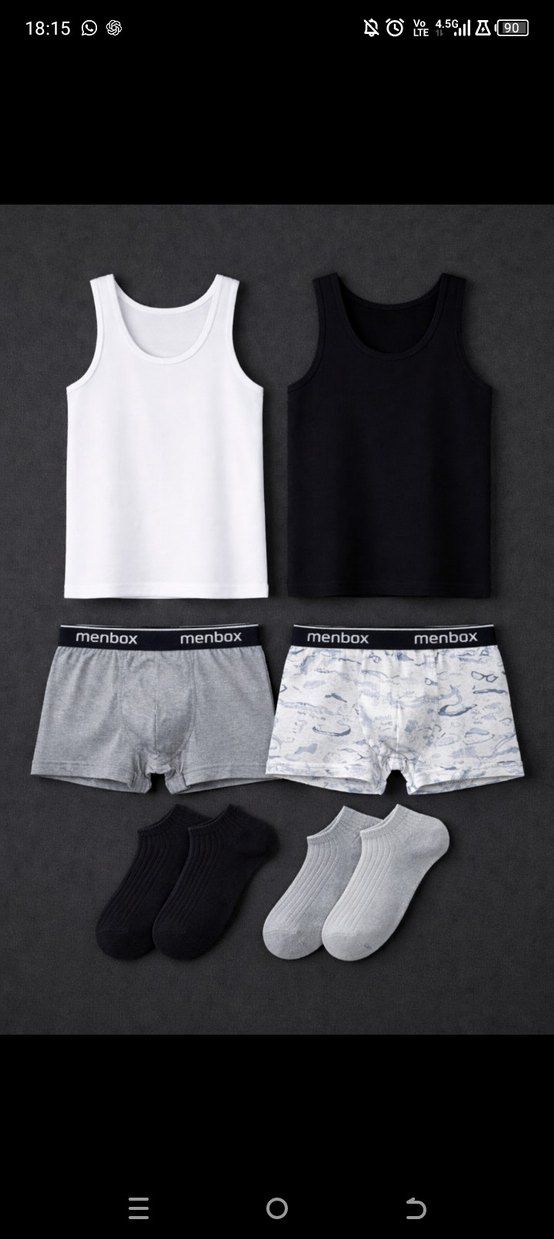 Erkekler için gri kısa boxer ve beyaz ile siyah renkli atlet seti. Menbox markalı, mini boy ve düz tasarıma sahip. Siyah ve gri çoraplar dahil. Bedenler: Atletler : tek beden L boxer: tek beden XL çorap: 40-45 standart beden