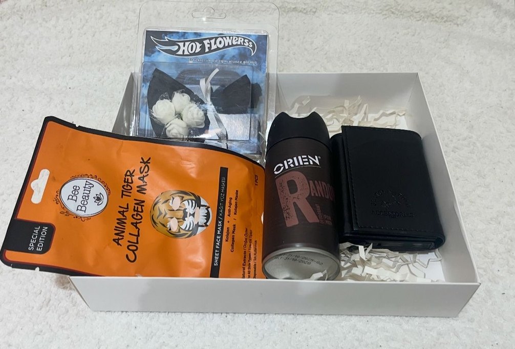 Kolajen yüz maskesi, Orien marka sprey ve çiçek aksesuarı içeren erkek bakım seti. Tek kutuda bakım ürünleri.