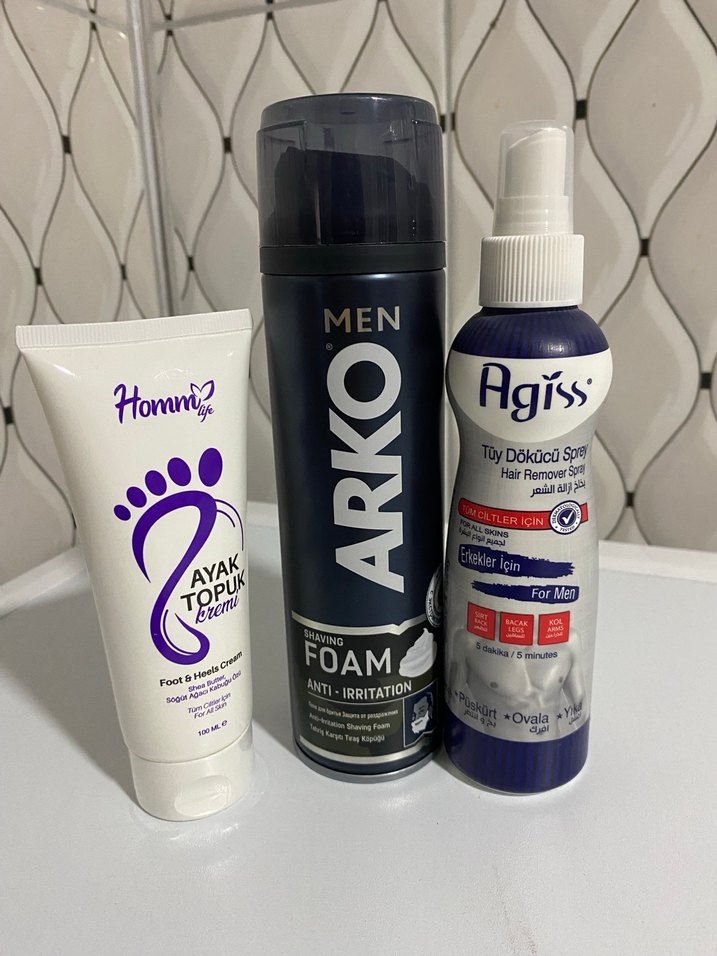 Hommi ayak topuk kremi, Arko Men tahriş önleyici tıraş köpüğü ve Agiss tüy dökücü sprey içeren erkek bakım seti.