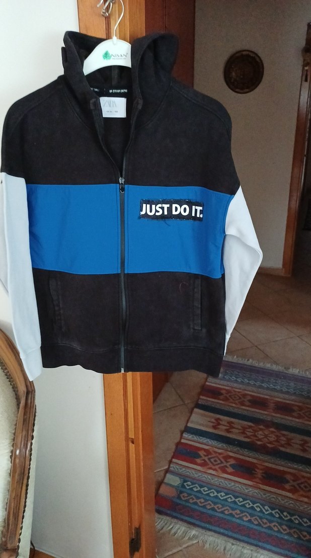 Erkekler için geniş kesim, uzun kollu, yuvarlak yaka sweatshirt. Yumuşak kumaştan, fermuarlı ve mavi-siyah renk bloklu "JUST DO IT." baskılıdır.