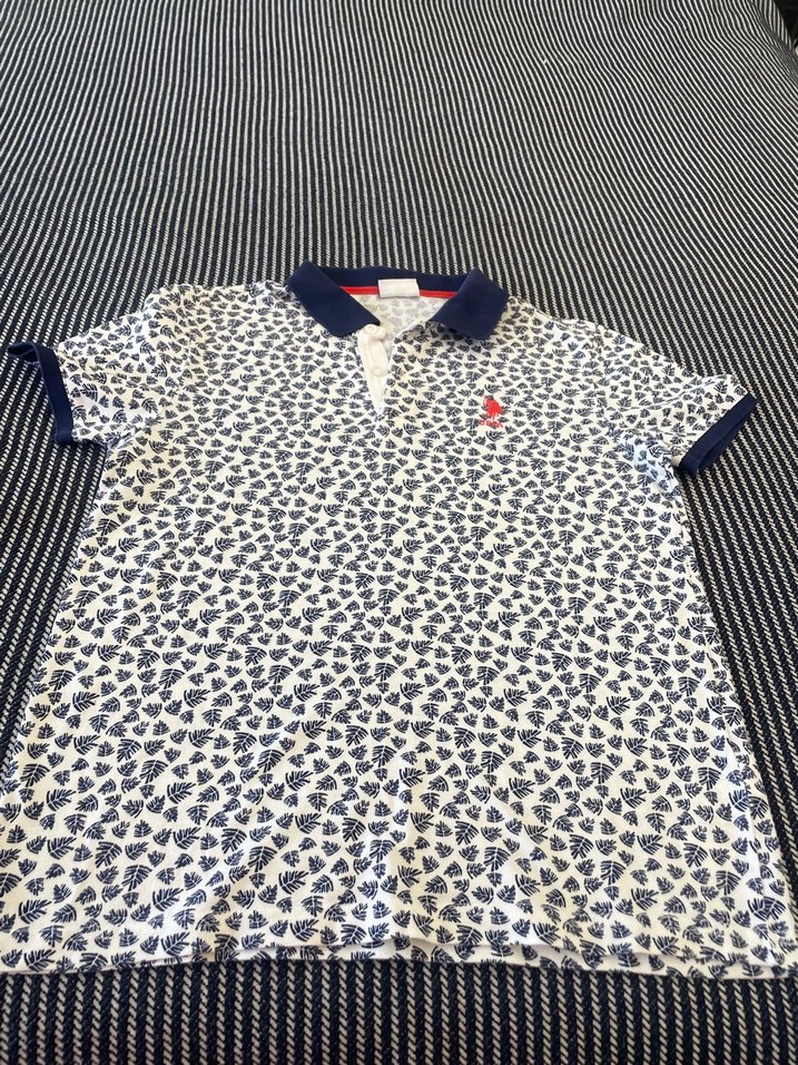Erkekler için beyaz sentetik kumaş üzerine koyu baskılı, düğmeli, yakalı ve kısa kollu, normal boyda, dar kesim polo tişört. Çok kısa süre giyilmiştır