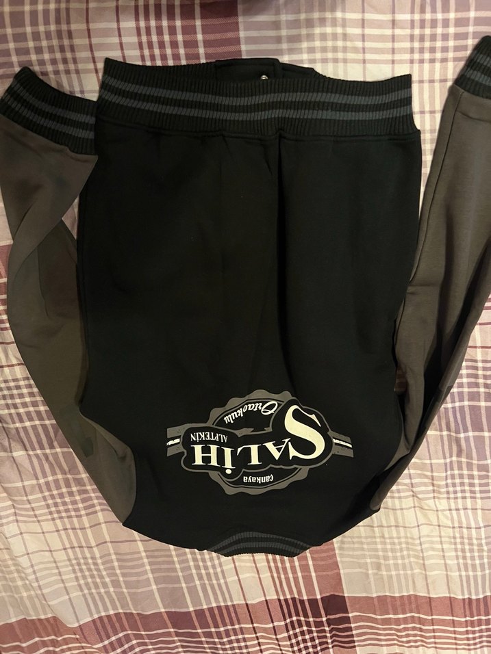 , bisiklet yaka ve önünde baskılı desen ile. Sentetik kumaştan ve fermuarlı. Siyah ve koyu tonlarda, ribanalı manşetli.