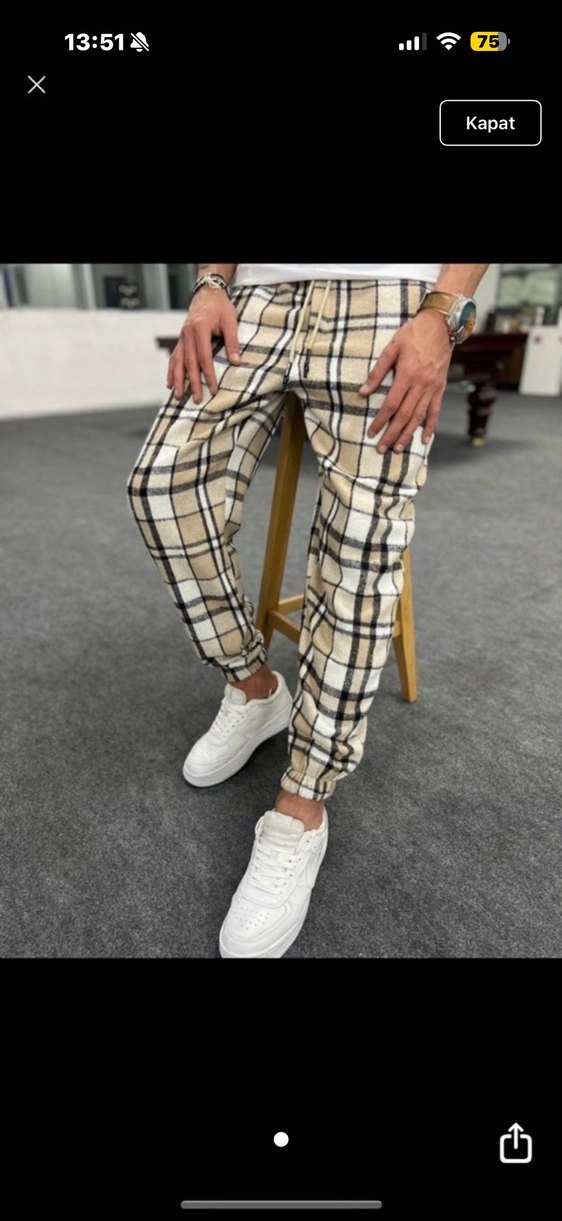 Açık kahverengi kare desenli, kemerli ve normal kesim erkek pantolon. Sentetik kumaştan, sokak stili için uygun. S bedeni mevcut