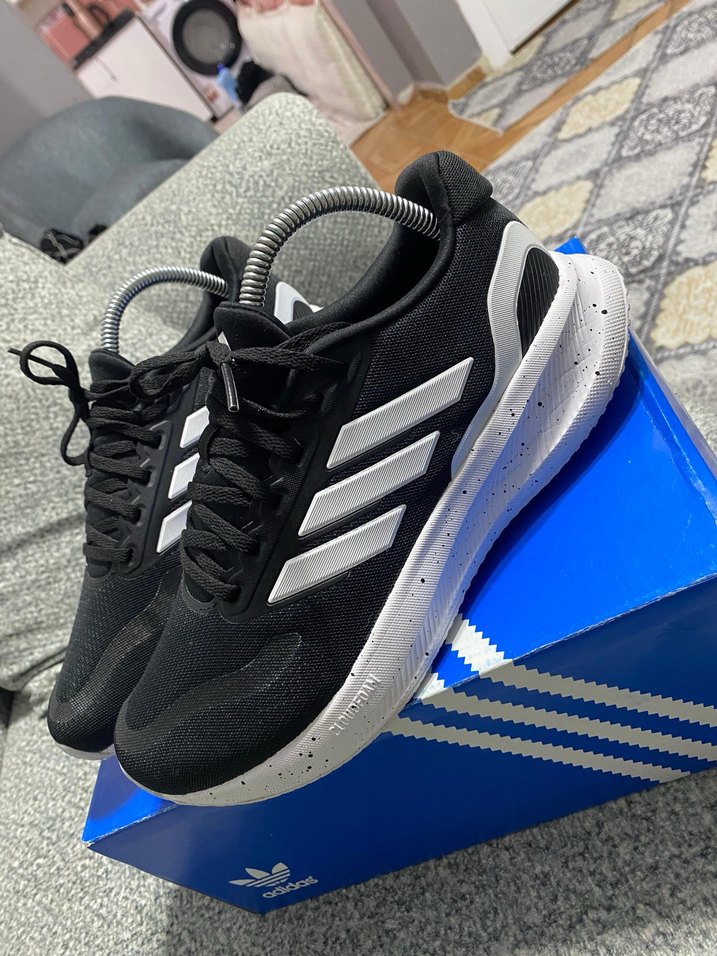 Siyah erkek koşu ayakkabısı, kauçuk taban ve cırt cırtlı kapanışa sahiptir. Spor ve sokak stili için uygundur. Desensiz tasarımı vardır.