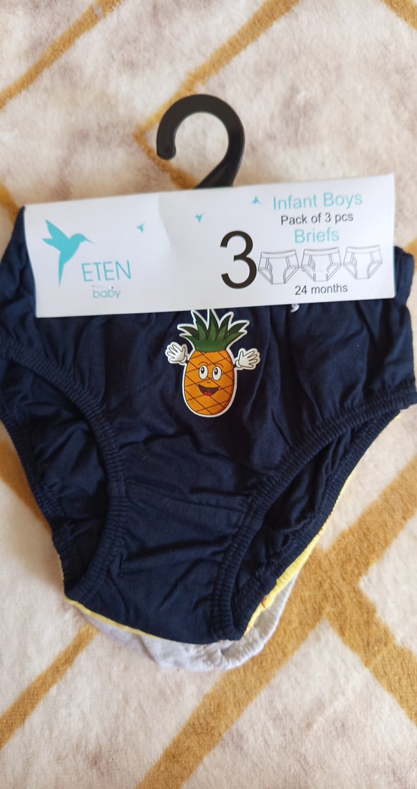 ETEN markasına ait, 24 aylık erkek bebekler için 3'lü koyu mavi baskılı külot seti. Yumuşak ve rahat kumaş, eğlenceli desenlerle.