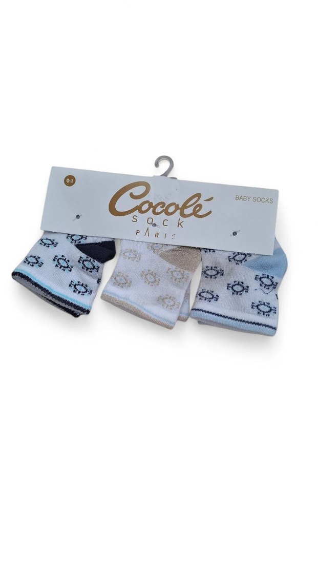 Sıfır, hiç kullanılmamış Cocolé Paris marka 3’lü bebek çorap seti. 0–1 yaş arası bebekler için uygundur. Yumuşak ve pamuklu yapısı ile bebeğinizin cildine dosttur.