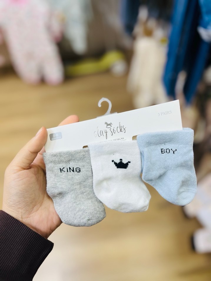 Üçlü erkek bebek çorap seti; gri, beyaz ve mavi renklerde, "KING" ve "BOY" yazılı baskılar ve taç motifi bulunur.