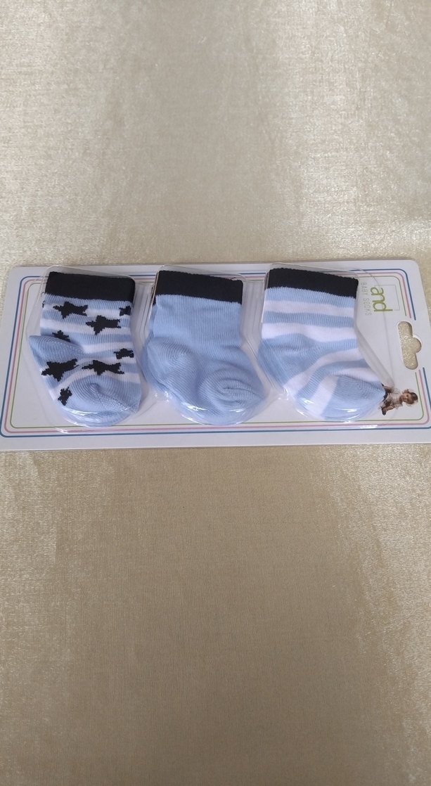 Mavi ve gri tonlarında, düz, çizgili ve yıldız desenli, yumuşak kumaştan yapılmış 3'lü erkek bebek çorap seti.