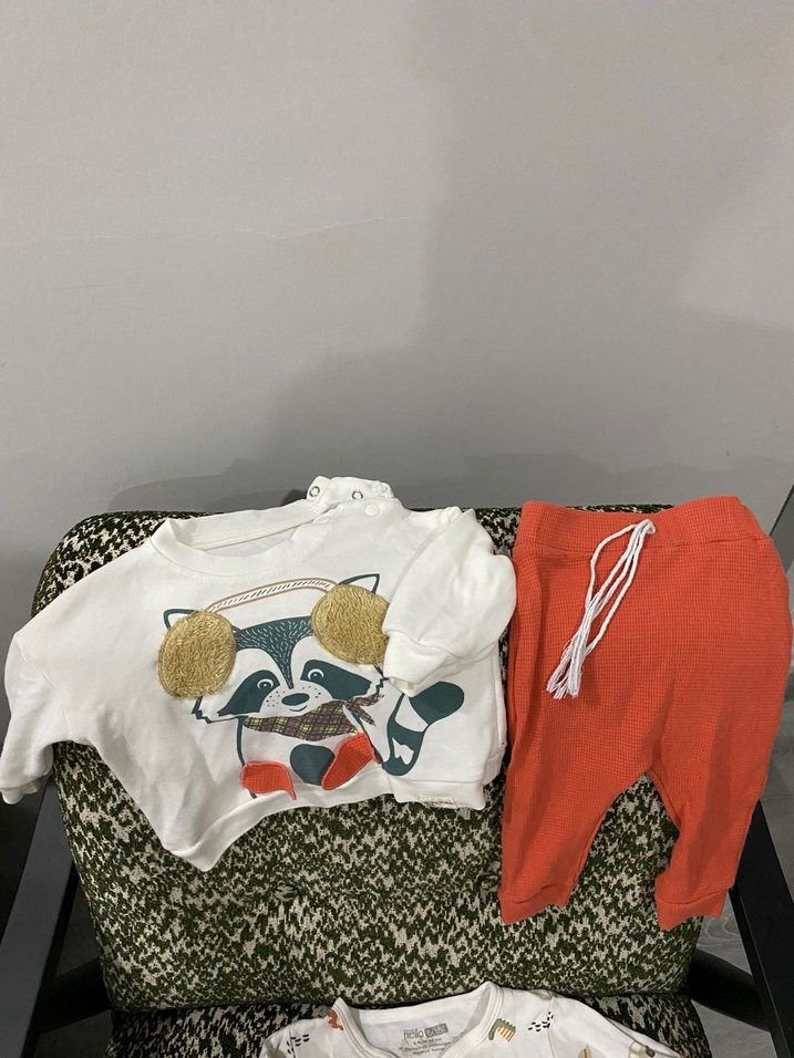 Pamuklu, renkli baskılı, örgü kulak detaylı beyaz uzun kollu üst ve turuncu bağcıklı pantolonlu erkek bebek takımı. 4 Adet alt-üst takım, 1 adet tulum, 2 adet kısa kollu zıbın. Zebralı takımın bedeni 6-9 diyor fakat üst bedenin kalıbı dar olduğu için 3-6 ay daha iyi olur diye düşünüyorum. Markalar karışık. LCW, Defacto ve başka markalara ait ürünlerdir. Zebralı takımın zıbınında leke var fotoğraflara ekledim bunun dışında hiçbirinde leke ya da sökük yok.