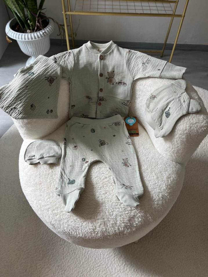 Resimde görüldüğü gibi ürün içeriği yenidoğan bebeğinize yakışacak hem rahatlık hem şıklık katacak 5 parça hastane çıkışı seti