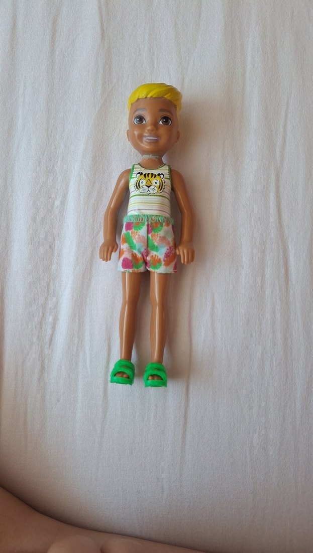 Açık tenli, sarı saçlı, kaplan baskılı tişört, renkli şort ve yeşil terlikli çok renkli erkek oyuncak bebek.
