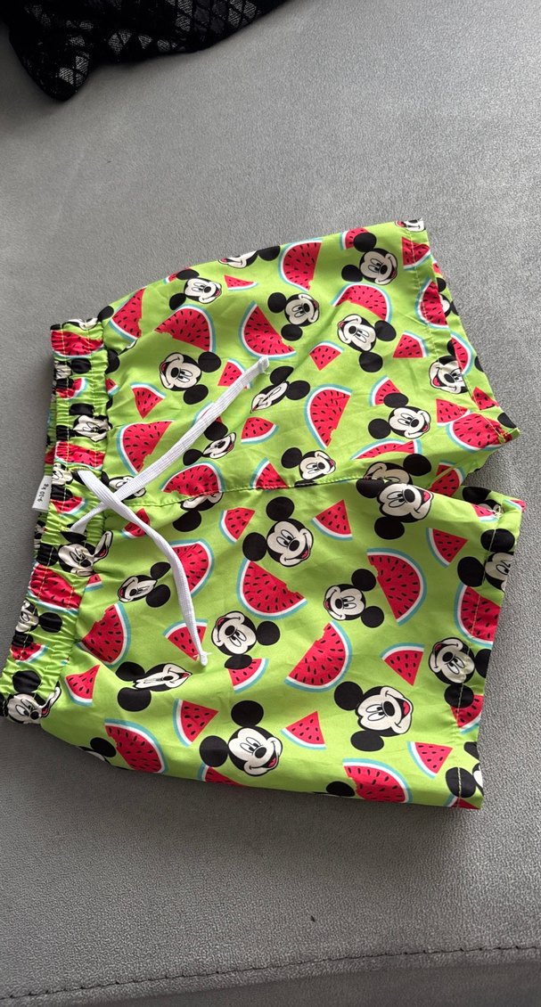 Renkli Mickey Mouse ve karpuz desenli, düğmeli ve lastikli bel detaylı, bol kesim mini erkek mayo, plaj için uygundur. ️