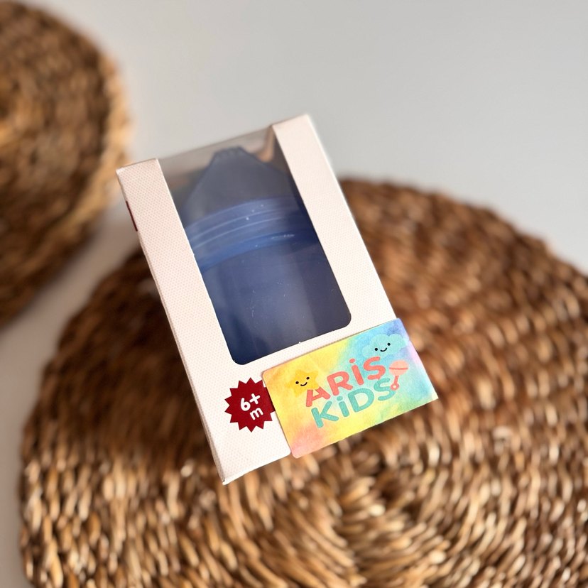 6 ay ve üzeri için uygun pastel mavi ARIS marka bebek biberonu, kolay besleme için tasarlanmıştır.