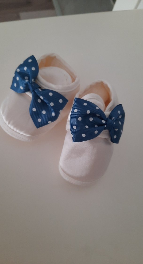 Yumuşak kauçuk malzemeden yapılmış, renkli puantiye desenli fiyonk detaylı beyaz erkek bebek patik. Sade ve klasik tasarım. Hiç giyilmedi takımı kullandım ama ayakkabı giydirmedim başka kullandım sıfırdır
