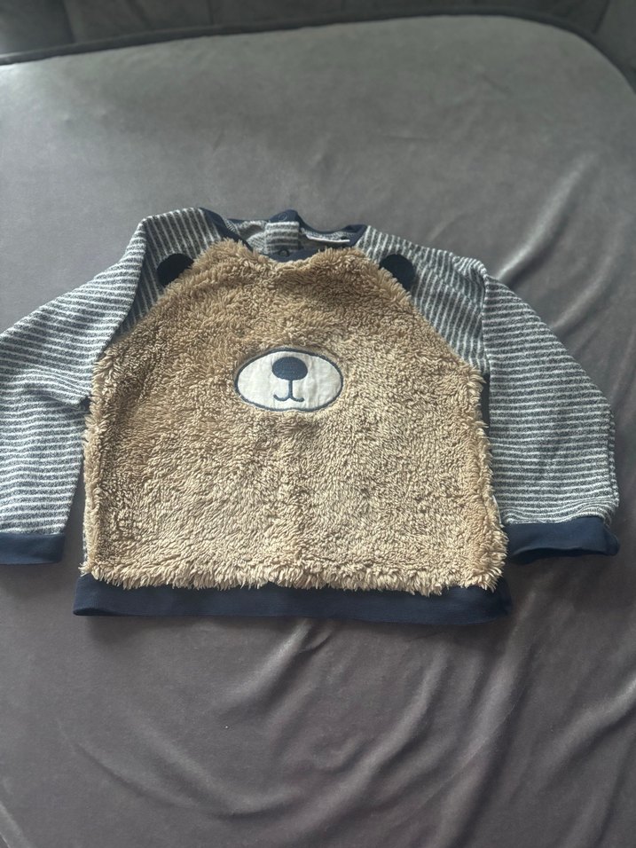 Erkek bebek sweatshirt, yuvarlak yaka ve uzun kolludur. Örme gri kollar ve yumuşak, tüylü ayıcık baskılı ön kısmı ile rahat kesim sunar.