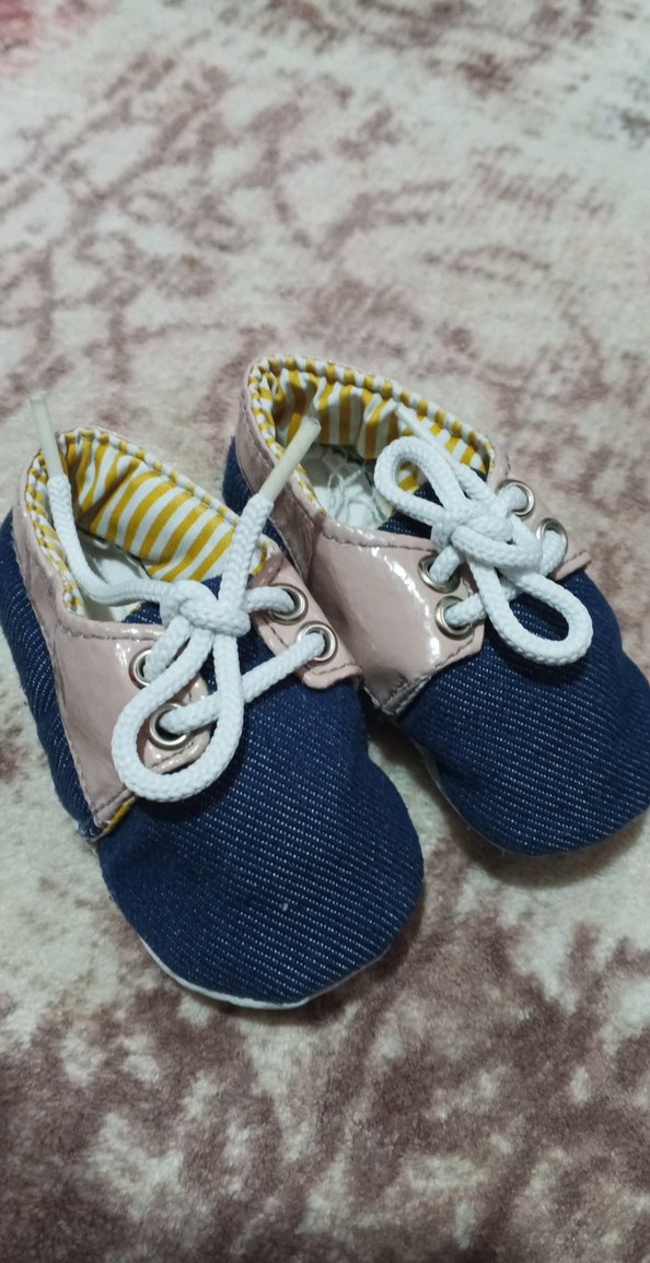 Denim malzemeden yapılmış, renkli batik desenli, beyaz bağcıklı ve çizgili iç astarlı erkek bebek ilk adım ayakkabısı hiç giyilmedi