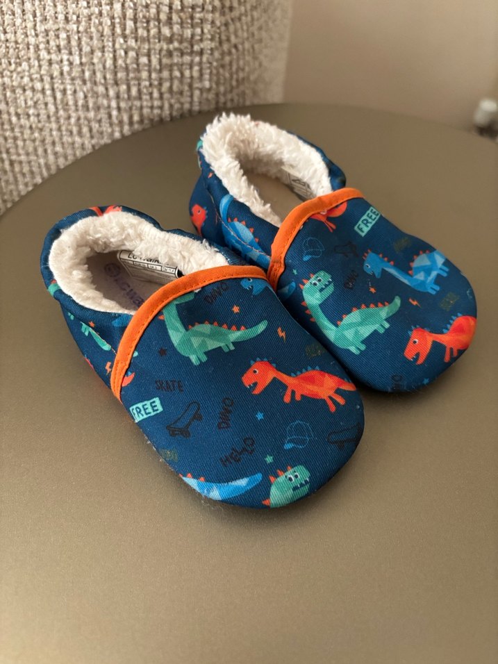 Renkli dinozor baskılı mavi erkek bebek ev ayakkabısı, yumuşak kürk iç astar ve kolay kullanım için cırt cırtlı kapanışa sahiptir.