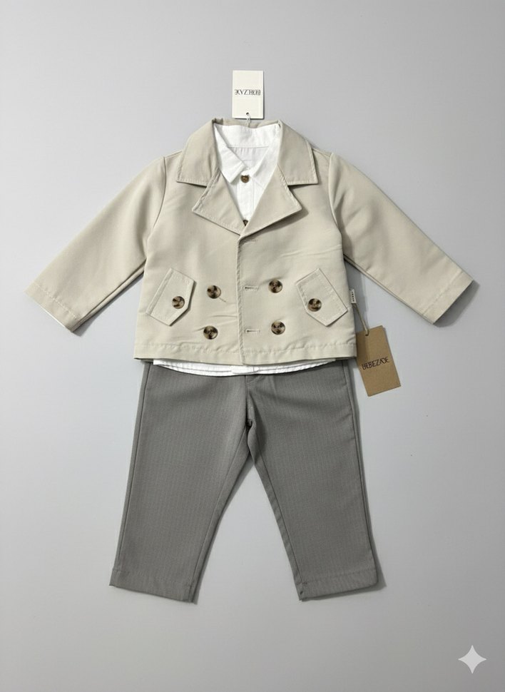 Erkek bebek için bej pamuklu, düğmeli, yakalı ceket ve gri uzun paça pantolon takımı. Desensiz ve rahat tasarım.