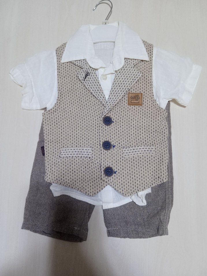 Pamuk kumaştan yapılmış, düğmeli bej yelek, kısa kollu beyaz gömlek ve gri şorttan oluşan erkek bebek 3'lü takım.